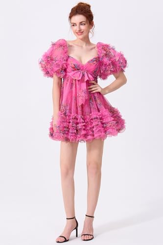 Short Puff Sleeves Homecoming Gowns for Teens 2024 Floral Print Multi-Layer Tulle A-Line Gathering Dress JP004 5