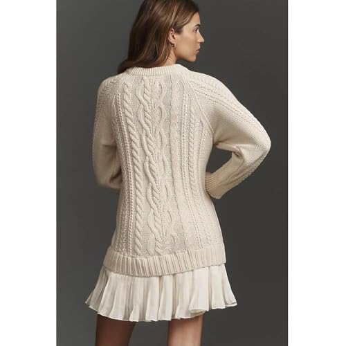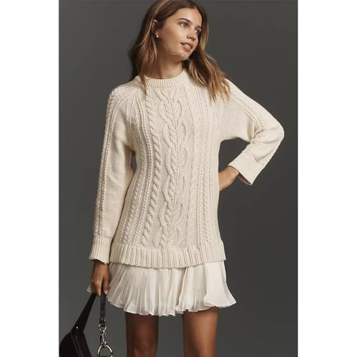 HOT ! Women Crewneck Cable Knit Sweater Mini Dress,Fall Cableknit Sweater Dress with Pleated Skirt,Womens Cable Knit Dresses