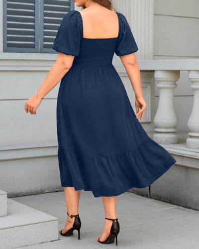 Plus Size Summer Dresses - Boho Casual Wedding Guest Midi Flowy Short Sleeves Smocked Button Down Dress for Curvy Women 6