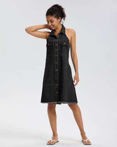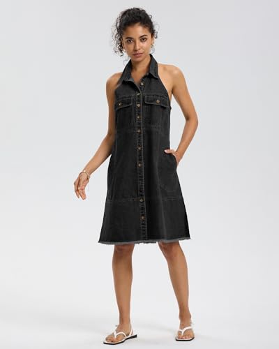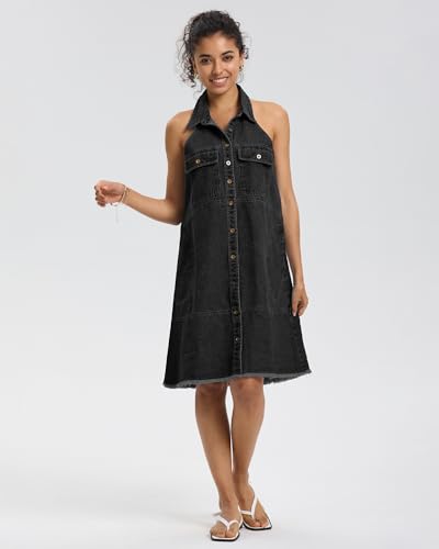 Locachy Women's Summer Sleeveless Halter Neck Button Down Denim Dress Casual A-Line Jean Shirt Dresses 6
