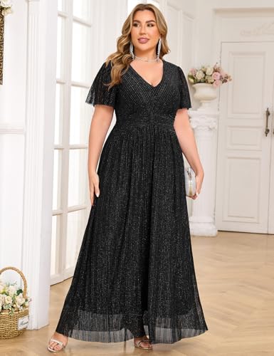 ZOMVA Plus Size Maxi Formal Dress Sparkly V-Neck A-line Ruffle Sleeves Evening Gown Cocktail Prom Lace 1