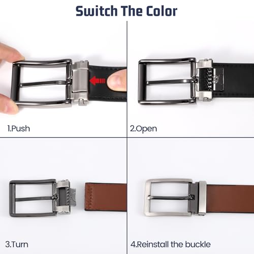 • 【Reversible Belt for Men】: 2 colors in 1 belt, you can have 2 colors at the same time, which can match your different clothes, and no longer have to worry about how to match your outfits. The metal buckle can be quickly removed and installed. It is simple to operate and can easily switch colors