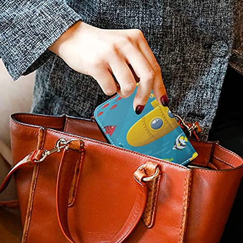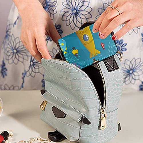 Colorful Cartoon Yellow Submarine Fishes Underwater Grey Credit Card Coin wallet, RFID Blocking Compact Women Leather Card Holder, Key Change Organizer, Zipper Purse Clutch Pouch Pocket 6