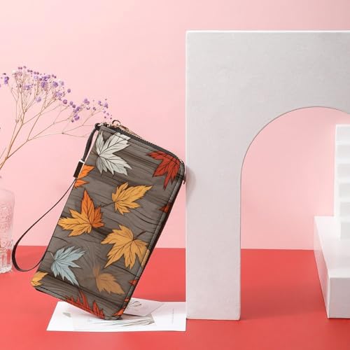HOT ! Maple Leaves on Rustic Wooden Board Autumn Leather Wallet Fashion Bifold Purse Long Pouch with Wrist Strap for Men Women