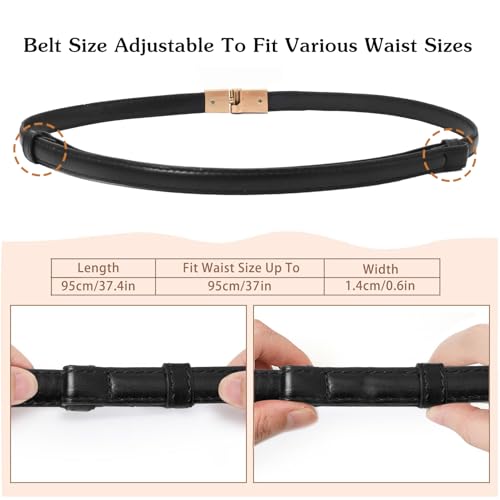 • Adjustable Thin Belt: The skinny leather belt adjusts the size by sliding the belt loop left and right, which is simple and convenient. They adjust to different types of pants or dresses very easily. They remain comfortable all day even if you eat a big meal!