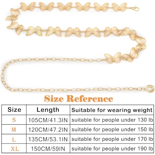 • Perfect Fit for All Sizes: Waist Chain Belt With a wide range of sizes available, including S: 41.3 in/105 cm, M: 47.2 in/120 cm, L: 53.1 in/135 cm, and XL: 59 in/150 cm, finding the ideal fit for your waist is effortless. Our chain belt offers versatility and adjustability, ensuring a snug and comfortable fit for everyone