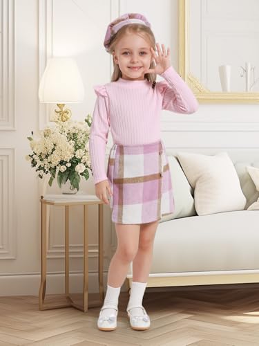 Patgoal Toddler Girls Fall Winter Clothes 3 Piece Outfits Kids Long Sleeve Ribbed Knit T Shirt Sweater Plaid Mini Skirt Set 4