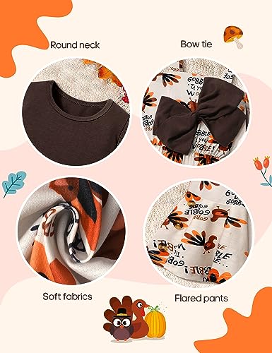• Prefect Match: This thanksgiving outfit toddler girl design is ruffle shoulder long sleeve tops, turkey pattern bell-bottom overalls, matching with headband. They can be worn as tow piece girl clothes set, or worn separately. Chest bow knot decorate make your children more attractive.