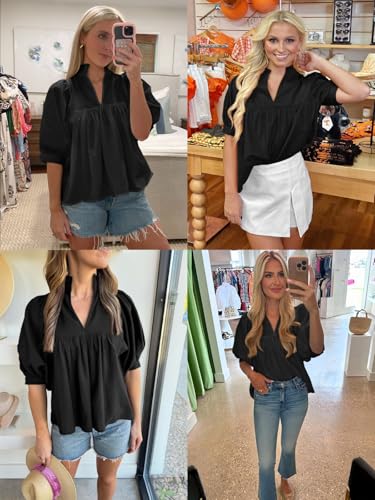 Cicy Bell Womens Puff Sleeve V Neck Blouse Babydoll Peplum Tops Dressy Casual Pleated Loose Fit Shirts 2