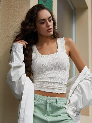 • Feature: This square-neck cami features a jacquard floral design with a lettuce-edge hemline. It is super soft and has a stretch fit. Pair this with distressed denim for a relaxed look you will love.