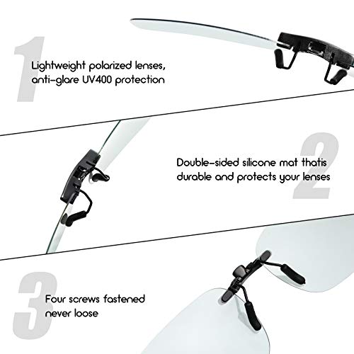 • Extensive applications: the rimless rectangle clip on sunglasses with a clear vision can make your driving safer; And with stylish design, the lightweight sunglasses are applicable for different outdoor activities, such as cycling, driving, running, fishing, racing, climbing, hiking and so on