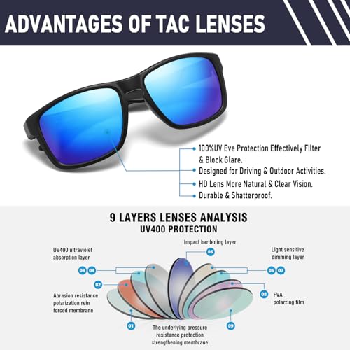 • PRECISE DIMENSIONS: With an outer width of 141.5mm (5.57in) and inner width of 131mm (5.15in), these polarized sunglasses men will love feature lenses 50mm (1.96in) high and 58mm (2.28in) wide, with a 18mm (0.70in) bridge and 139mm (5.47in) temple length.
