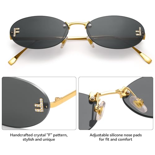 • ✨ Exclusive Diamond "F" Artistry - ULTRA-LIGHT RIMLESS OVAL SUNGLASSES → Handset crystalline "F" motifs on each oval sunglasses lens create a captivating light-play effect unseen in mass-market shades.Harmonious fusion of oval contours + geometric accents - where today's top oval sunglass trend meets timeless luxe detailing.