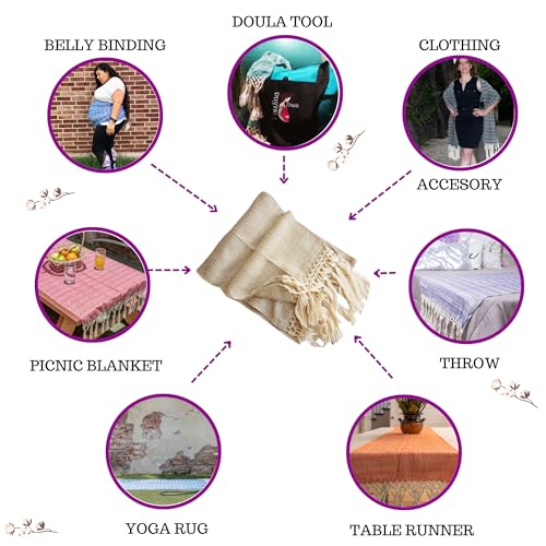 • Suitable for belly binding, doula tool (natural birth), clothing accessory (pashmina, shawl, pareo, blanket scarf), home decor (table runner, bed throw, tapestry, table cover ) yoga rug, prayer mat, meditation mat, picnic blanket, beach blanket, play mat