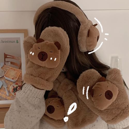 HOT ! Cute capybara plush scarf, winter thickened plush scarf, Capybara Gloves,Cute ear warmer,3-in-1 Cap Gloves Scarf Set