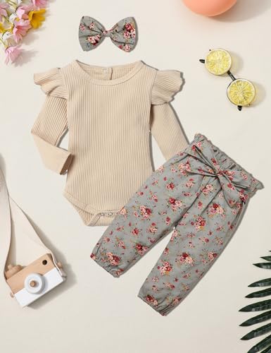 KANGKANG Newborn Baby Girl Clothes Ribbed Ruffle Sleeve Romper + Floral Pants + Headband Cute Infant Baby Girl Outfit 3Pcs 4