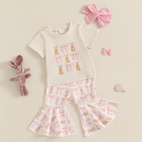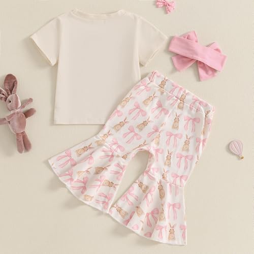 Lamuusaa Toddler Baby Girl Easter Outfit Short Sleeve Bunny Bow Print T-shirt Flared Pants Headband Summer Outfits 6M-4T 1
