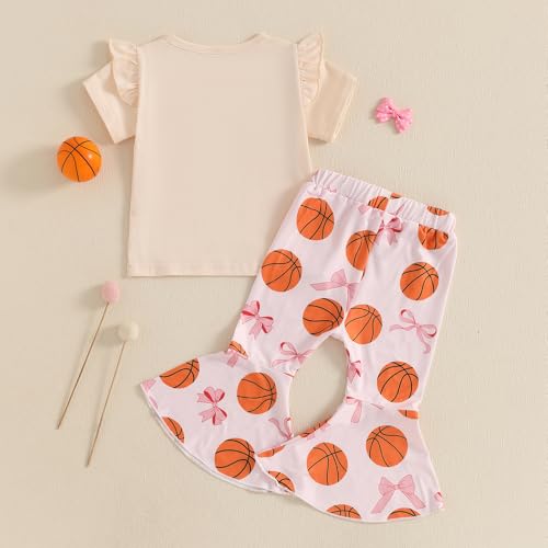 • CUTE DESIGN: Baby girl summer clothes, baby basketball outfit, toddler girl basketball outfit, girls fashion outfit with basketball bow print, adding a touch of fashion; Baby girl t-shirt with ruffles, short sleeve and round neck; Baby girl flared pants with elastic waist design, toddler girl bell bottom outfit, toddler girl summer outfit, make y baby stand out in the crowd