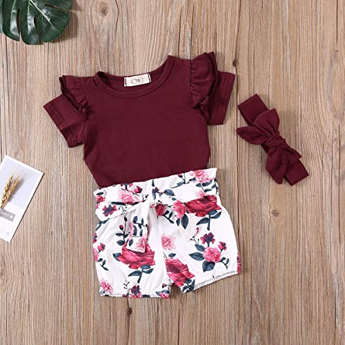 Baby Girls Summer Shorts Set Ruffle Short Sleeve Top T-Shirt Floral Shorts Headband Clothes Set 2
