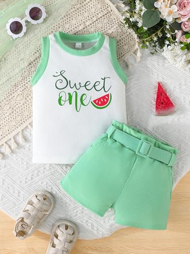 • Cute Design: Our baby girl outfits contain Sweet One and watermelon matching sleeveless top plus soft knit shorts with solid color belt, let your girl be the most fashionable baby girl.