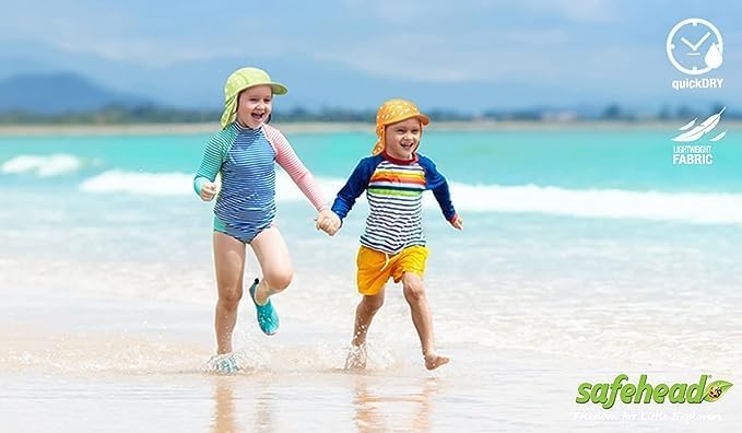 • 🌞LIGHTWEIGHT PROTECTIVE FLAP FOR NECK : These adorable Summer Fun Splash caps from Safehead features a lightweight protective flap to cover the neck and ears.