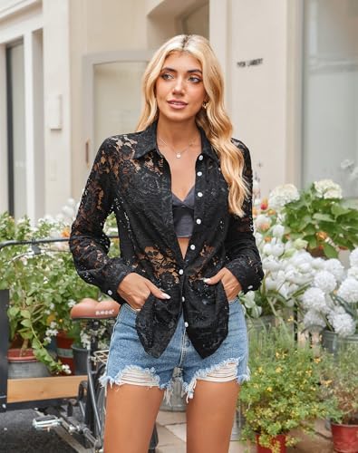• UNIQUE DESIGN: Long sleeve, lapel neck, button down , cuffs with an adjustable button, solid color, hollow out, see through floral lace design, easily combines elegance, classiness and sexiness. See Through Lace Top / Long Sleeve Shirts For Women / Blouses & Button-Down Shirts / Sheer Top Fall.