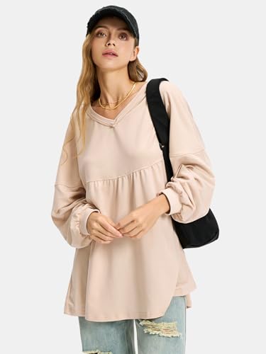 • Feature: Womens oversized pullover tops, cute spring tops for women, loose babydoll style, long sleeve shirt, V-neck pullover, slight stretch, solid color, spring outfits for women 2025. Casual and fashionable style fits any body shape, making it a necessary lightweight sweatshirt for women's wardrobes