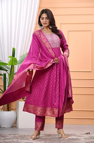HOT ! Women's Embroidered Anarkali Kurti Pants Set with Cotton Dupatta Flared Long Ethnic Dress for Partywear