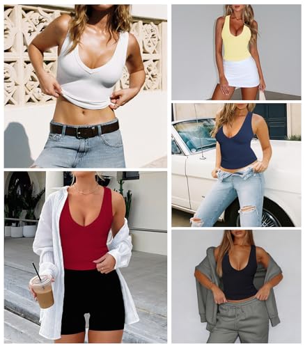 • 【Features】: Low cut tank tops for women features a plunge deep v neck, cropped length, bodycon slim fit, sleeveless and fitted but not too tight design creates a flattering silhouette perfect for layering or wearing alone.