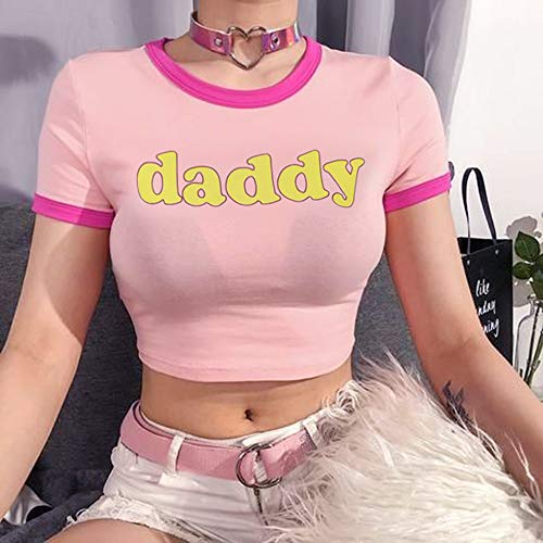 Crop Top Women Girl's Pink Crew Neck Sexy Short Sleeve Daddy Tight Midriff-Baring T-Shirt 5