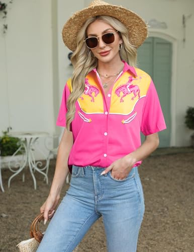 HOT ! Western Shirts for Women Retro Cowgirl Shirt Rodeo Button Up Tshirt Hawaiian Summer Vacation Short Sleeve Top Blouses