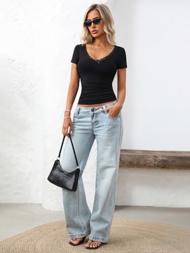 More information about Rooscier Women's Lace V Neck Tee Short Sleeve Slim Fit Bow Knot T Shirt Top