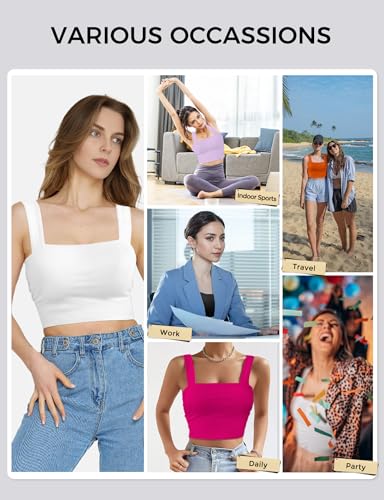 • 🌸Comfortable material: This square-neck women's crop top is made of 92% polyester and 8% spandex, skin-friendly, lightweight, breathable and high stretchy, not easy to shrink or deform. You can wear this double-lined tank top comfortably without wearing a bra. Not see through at all even in white color! The proper elasticity makes it close to your skin, not too tight or loose, It's a sexy going out top or sport bra in the summer and also can be used as a basic layer in the fall or cool weather.