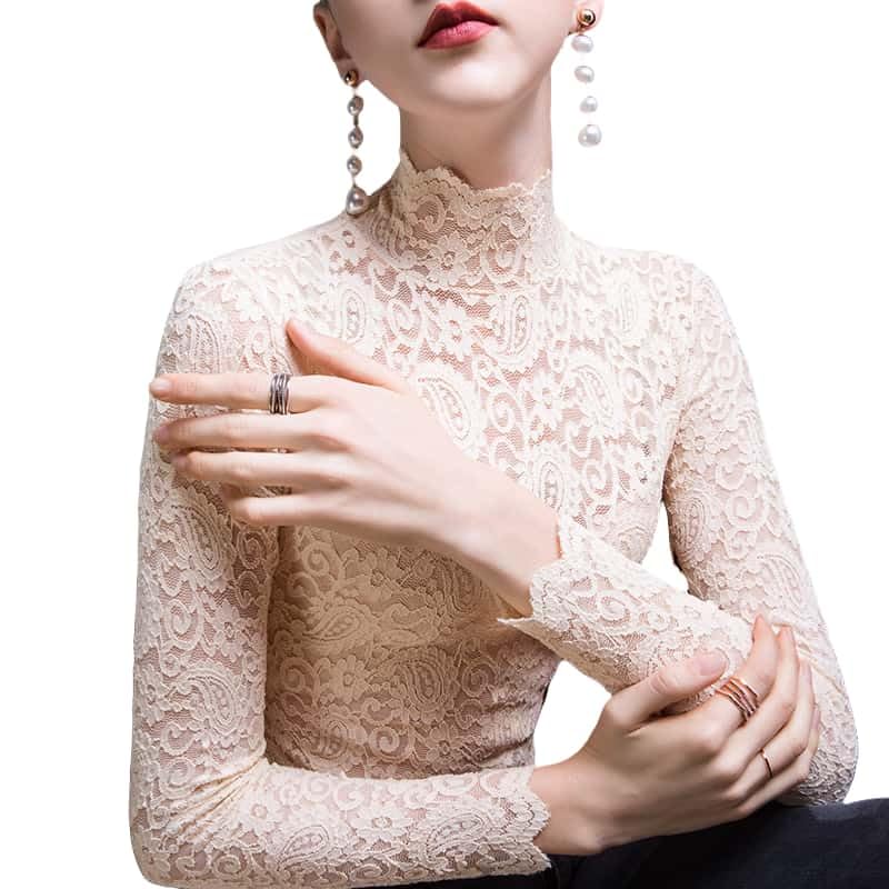 More information about Women's Sexy Slim Fitting Long Sleeved Turtleneck Pullover Bottom Shirt Mesh Lace Perspectives T-Shirt Top