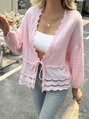 Tankaneo Womens Deep V Neck Tie Front Blouse Cotton Long Puff Sleeve Eyelet Tops Cute Lace Trim Flowy Ruffle Shirts 6