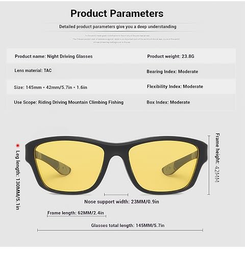 • **ONE SIZE FITS MOST**: These Night Driving Glasses for Men Women feature a versatile design that fits most face shapes comfortably. With dimensions of 63mm lens width, 46mm lens height, and a 145mm total frame width, they are perfect for most men and women, providing a secure and comfortable fit for a variety of outdoor activities.
