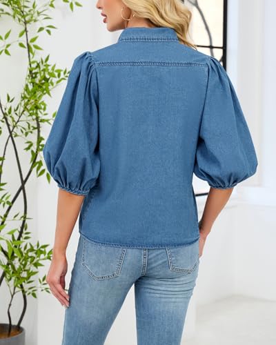 Women's Puff Sleeve Denim Shirt Button Down Lightweight Casual Jean Blouses 4