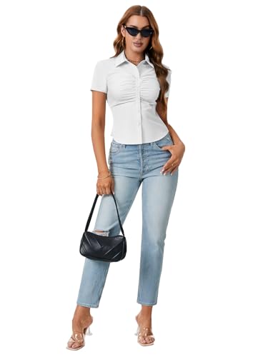 More information about LYANER Women's Collared V Neck Button Down Ruched Slim Fit Short Sleeve Work Shirt Blouse