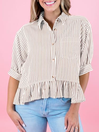 More information about Womens Peplum Top Striped Ruffle Shirts 3/4 Sleeve Button Down Cute Cropped Blouse