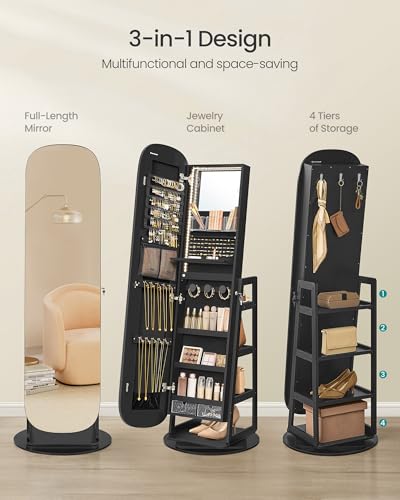 SONGMICS LED Jewelry Cabinet, 360° Swivel Jewelry Organizer, Lockable Mirror Jewelry Cabinet Standing, Rounded Wide Full-Length Mirror with Storage Shelves, Interior Mirror, Ebony Black UJJC036B01 1