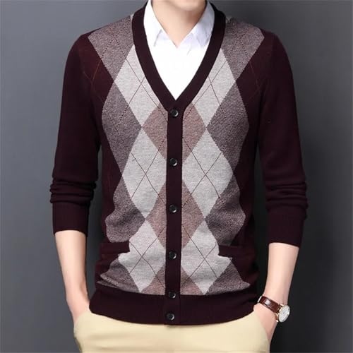 Men's Spring Fall Argyle Patchwork Knit Cardigan V-Neck Smart Slim Fit Knitted Sweatercoat 1