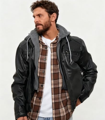 More information about INVACHI Men’s PU Faux Leather Aviator Bomber Jacket Windproof Vintage Motorcycle Jacket with Removable Hood & Pockets