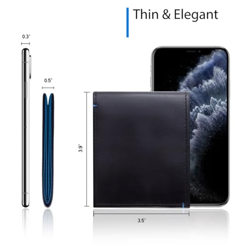 HOT ! Slim Leather Wallet for Men & Women – Genuine Leather Bifold Card Holder – Handmade Minimalist Wallet with Multiple Card Slots & Bill Compartments – Front Pocket Design – Black & Blue