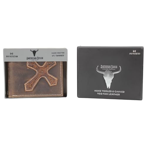 HOT ! American Bison Tooled Cross Western Wallet for Men – Oil Pull Up Bifold – Rugged Faith & Everyday Durability (brown)