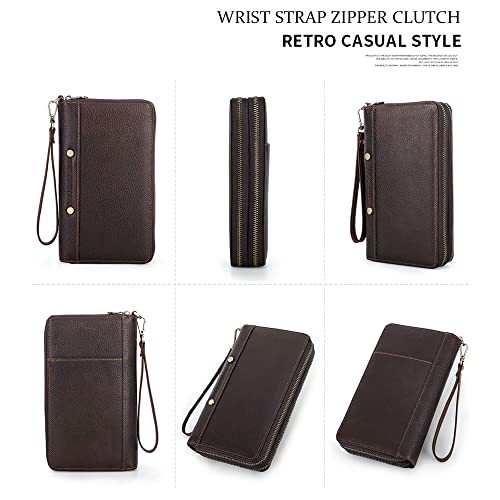 Contacts Mens Leather Clutch Bag Large Capacity Card Holder Travel Wrist Wallets Brown Checkbook Passport Purse Handbag with Rfid 6