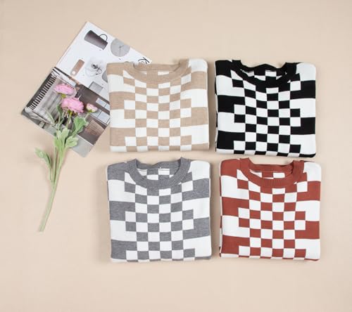 KevaMolly Womens Long Sleeve Sweaters Checkered Print Drop Shoulder Round Neck Sweater Casual Daily Winter Sweater 6