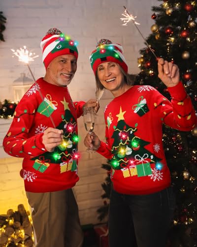 Liitrsh 3 Pack Christmas Tree Light up Ugly Sweaters for Women 2024 Knitted Xmas Tree Reindeer Hat Socks for Adults Holiday 2