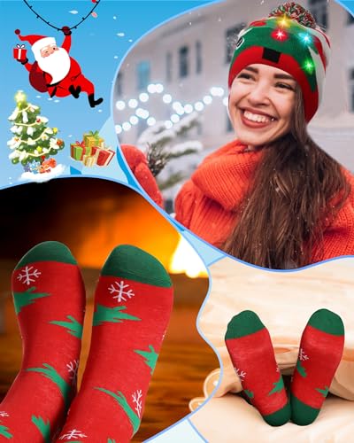 Liitrsh 3 Pack Christmas Tree Light up Ugly Sweaters for Women 2024 Knitted Xmas Tree Reindeer Hat Socks for Adults Holiday 7