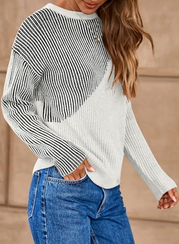 Sidefeel Womens Long Sleeve Crewneck Color Block Pullover Sweaters Casual Striped Loose Knit Tops Trendy Fall Outfits 2
