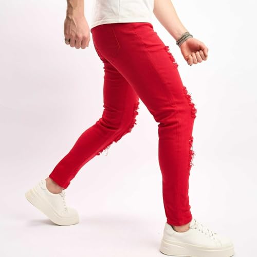 HOT ! Jeans Pants Trousers Denim Stretch Slim Fit Perforated Trendy Street Worn Hole Red Retro White Tapered Casual Tight for Men